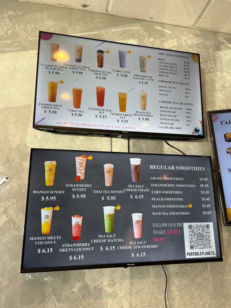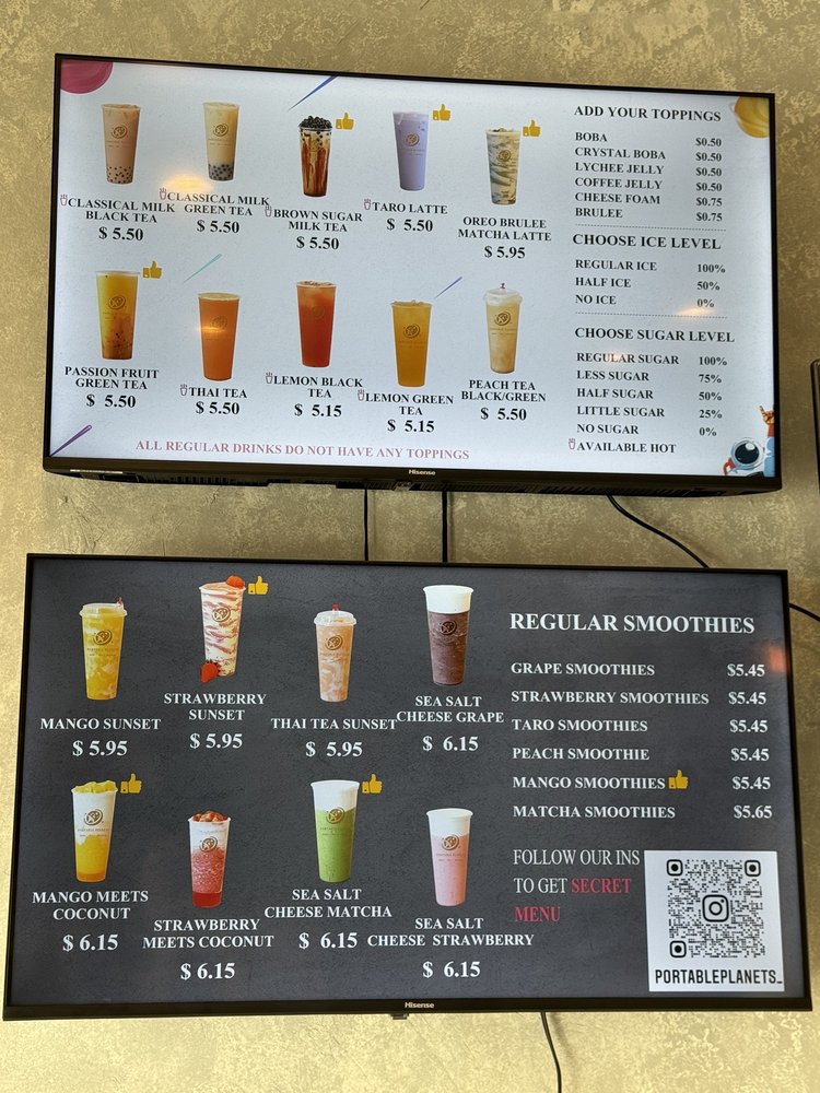 Welcome to Boba Tea Planets, an innovative hotspot located in Santa Ana, CA, that caters to your cravings for both delightful drinks and scrumptious bites. The menu features a vibrant selection of fruit teas including refreshing options like Lemon Black Tea and Passion Fruit Green Tea, perfectly priced between $5.69 and $6.15. If you're in the mood for something creamy, the smoothies are a must-try—think Mango Meet Coconut or indulgent Sea Salt Cheese flavors, ranging from $6.59 to $6.79.